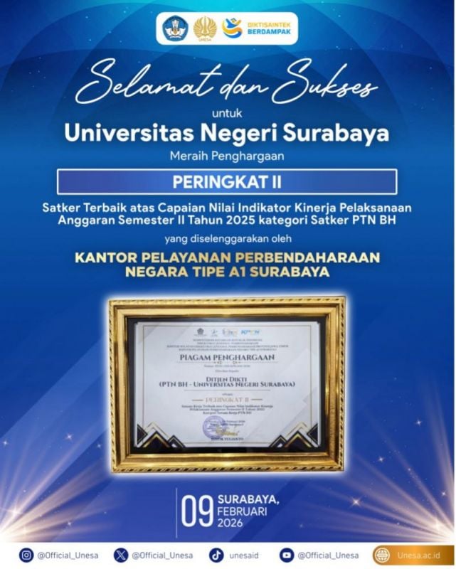 Unesa.ac.id. SURABAYA— Direktorat Keuangan Universitas Negeri Surabaya (Unesa) menorehkan prestasi membanggakan dengan meraih Peringkat II Satuan Kerja Terbaik atas Capaian Nilai Indikator Kinerja Pelaksanaan Anggaran (IKPA) ...