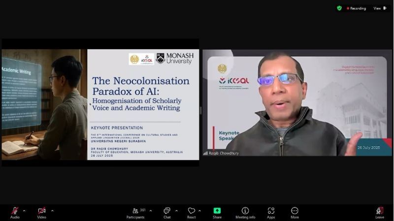Raqib Chowdhury, dari Monash University (Australia) yang memaparkan terkait “Paradoks Neokolonisasi AI: Homogenisasi Suara Ilmiah dan Tulisan Akademis.” Ada tiga paradoks AI yaitu: AI memberdayakan penulis, AI menawarkan inklusi, dan AI menawarkan dukungan. Padahal sejatinya telah terjadi neokolonisasi AI yang saat ini terjadi dengan memperparah hegemoni dan geopolitik penulisan akademik ala barat.