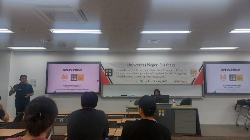Unesa.ac.id., SURABAYA--Sejumlah dosen Universitas Negeri Surabaya (UNESA) yang tergabung dalam PKM Internasional mengenalkan budaya Indonesia kepada puluhan mahasiswa Busan University Foreign Studies (BUFS), Korea Selatan, pada 14-15 September 2023.