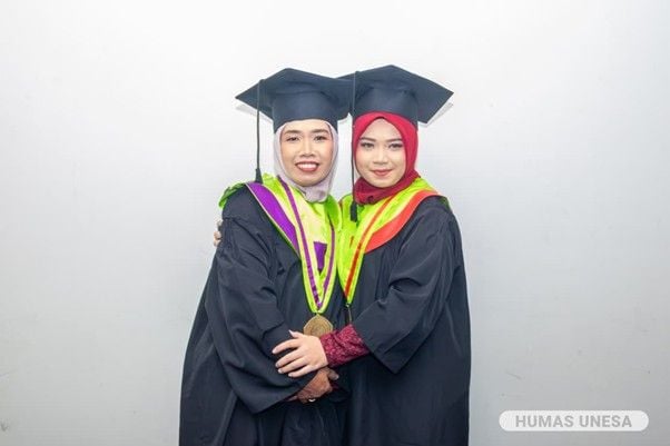 Unesa.ac.id. SURABAYA—Suasana wisuda ke-118 Universitas Negeri Surabaya (Unesa) di Graha Unesa pada Rabu, 11 Februari 2026, menyisakan cerita yang menginspirasi. Di tengah ribuan wisudawan, sosok ibu dan anak, Sri Wahyuningsih dan putrinya, Sahda Atthiyah Tsaqif Qonita, mencuri perhatian karena berhasil menyelesaikan studi dan diwisuda pada hari yang sama.