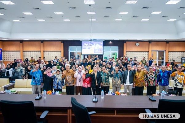 Unesa.ac.id. SURABAYA— Hadiah paling bermakna dari murid kepada gurunya adalah memastikan gagasan sang guru terus hidup dan berkembang. Semangat itulah yang melatarbelakangi Fakultas Bahasa dan Seni (FBS) Universitas Negeri Surabaya menggelar Temu Alumni Magister dan Doktor Pascasarjana FBS sekaligus Bedah Buku “Seni, Sastra, dan Budaya Lokal: Pendekatan Multi-, Inter-, dan Trandisipliner”, pada Sabtu, 22 November 2025, di Auditorium Lantai 11 Gedung Rektorat Kampus II Lidah Wetan.