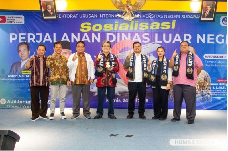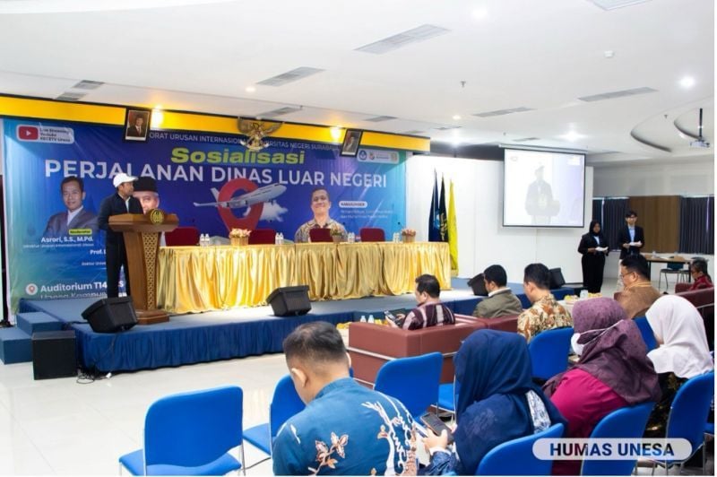 Unesa.ac.id. SURABAYA—Universitas Negeri Surabaya (Unesa) melalui Direktorat Urusan Internasional menyelenggarakan Sosialisasi Perjalanan Dinas Luar Negeri (PDLN) di Auditorium T14 Fakultas Bahasa dan Seni (FBS), Kampus II Lidah Wetan, pada Kamis, 24 Juli 2025.